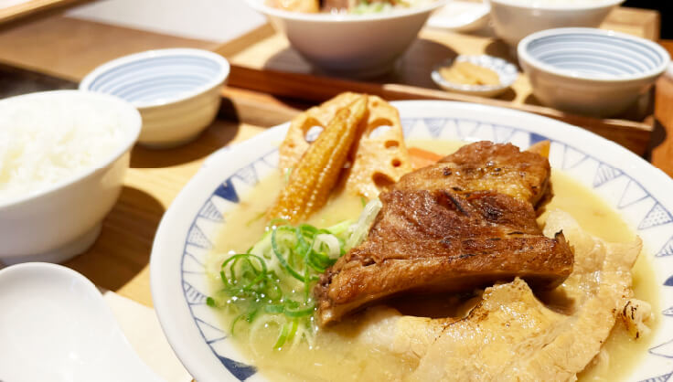 ごちとんビジアカから徒歩2分。具だくさん"ごちそう豚汁"定食の専門店。人気店のためランチが行列も!