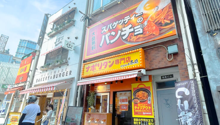 スパゲッティーのパンチョビジアカから徒歩2分。ナポリタン専門店で定番から変わり種にカレーまで!メガ盛りもあるので大柄の男性の先生方からの支持もアツいお店です!
