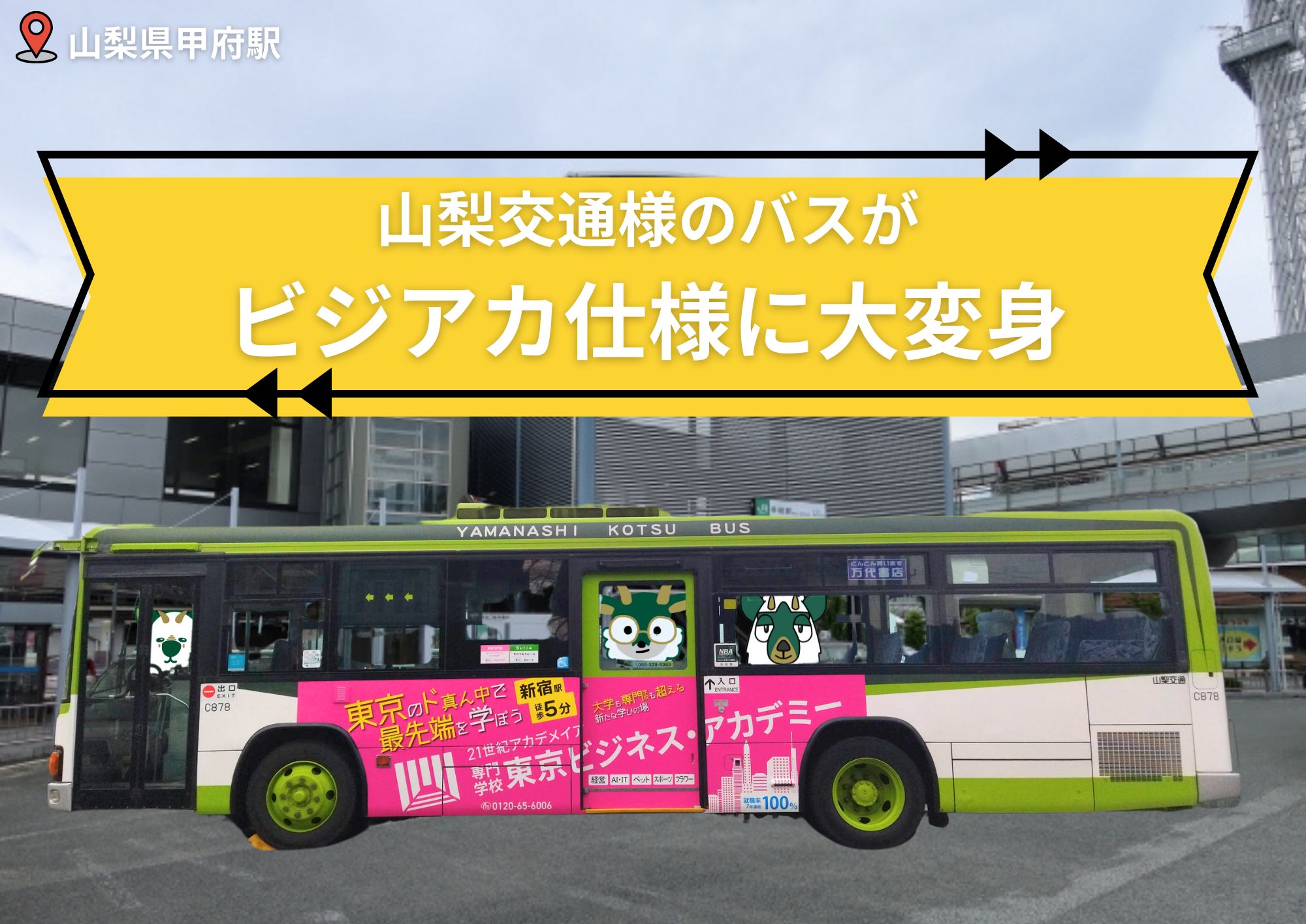 東京ビジネス・アカデミーのオリジナルデザインを施した ラッピングバス が、2024年12月21日から運行をスタートしました。このバスは、甲府駅を始発・終着点とする主要路線で、1年間運行されます。ビジアカらしさを表現したデザインが、地域の街並みを彩ります。 SNSでシェア&交通費サポートアップ! もし