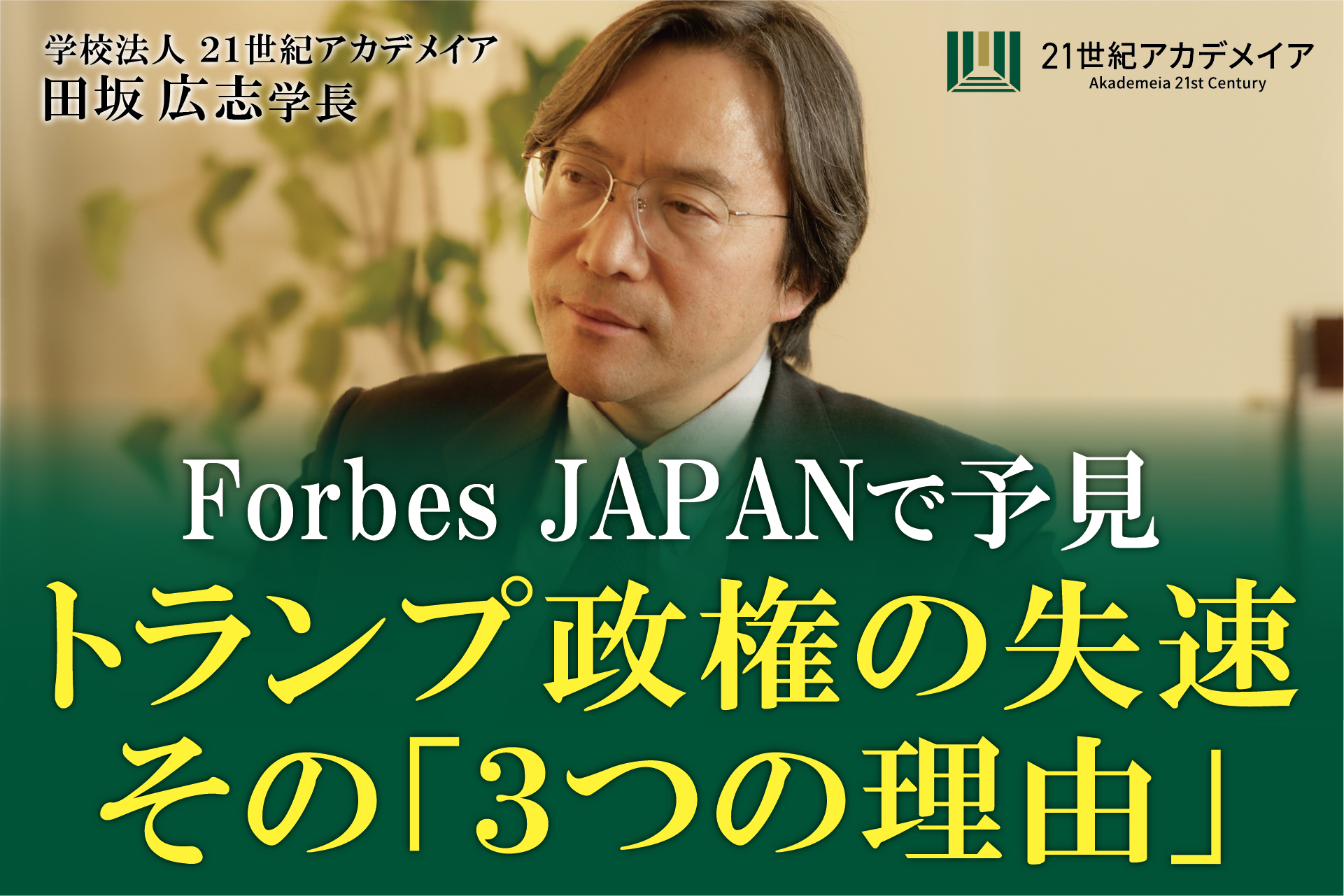 2025/01/31プレスリリース21世紀アカデメイアの田坂広志学長が、経済誌「Forbes JAPAN」に寄稿。いま絶頂のトランプ政権が、なぜ、まもなく組織的混乱と公約不履行、支持率激減に向かうかを、経営の視点から予見