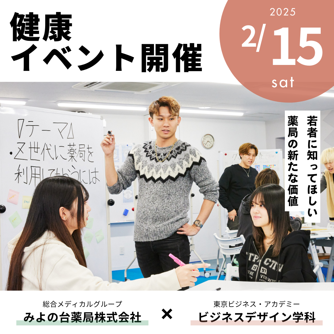学校法⼈ 21世紀アカデメイア(学⻑:⽥坂広志、本部:東京都千代⽥区)のビジネス総合学校「東京ビジネス・アカデミー」(校長:稲場央人、東京都渋谷区)は、2025年2月15日(土)に、首都圏の他、関東・中部等に全78店舗展開している大手調剤薬局「みよの台薬局株式会社」と共同で健康相談イベントを開催いた