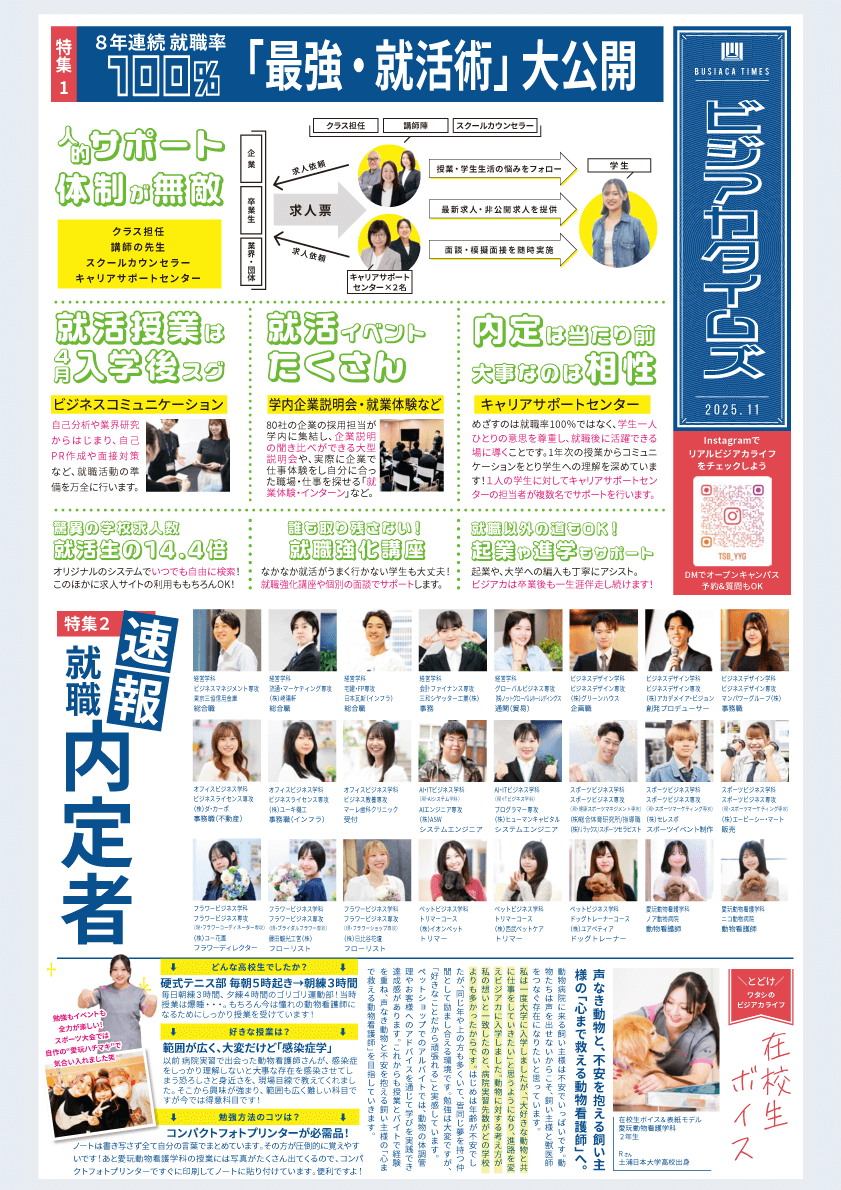 最新の入学情報や学科紹介に加えて、在校生の声も掲載されています。