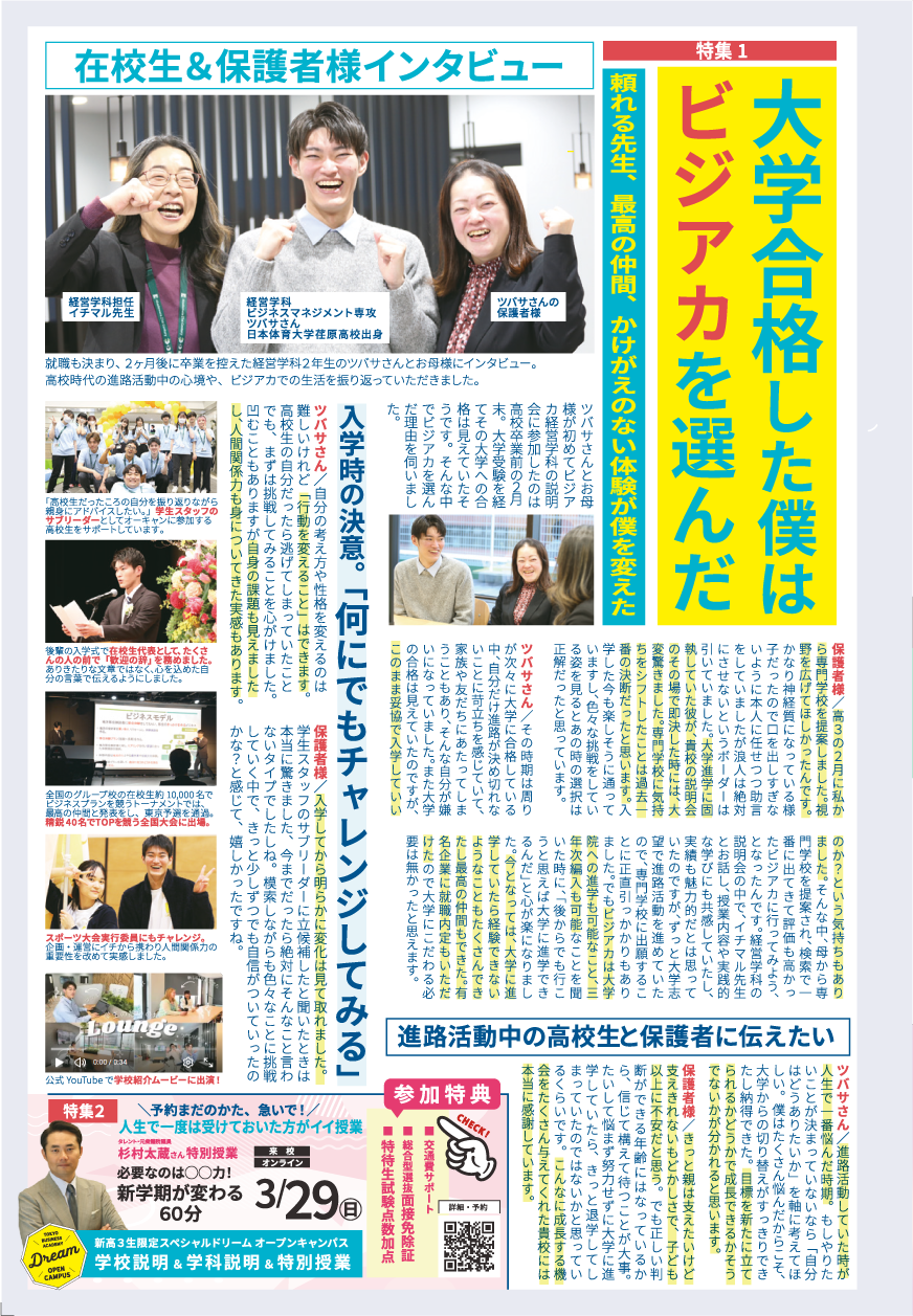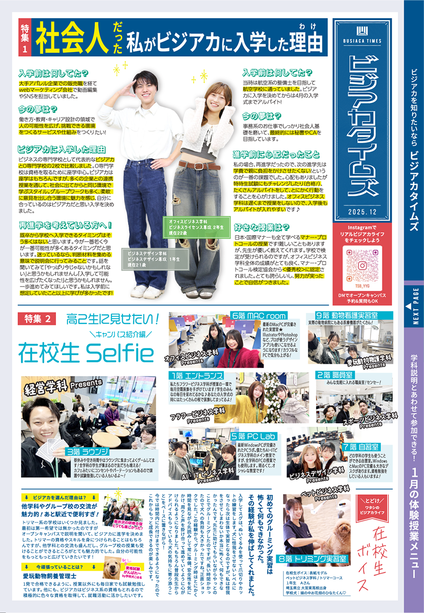 毎月発行のオープンキャンパスのお知らせに連載中のビジアカ情報ページ!最新の入学情報や行事紹介、在校生の声など、ビジアカのキャンパスライフがまるわかり♪